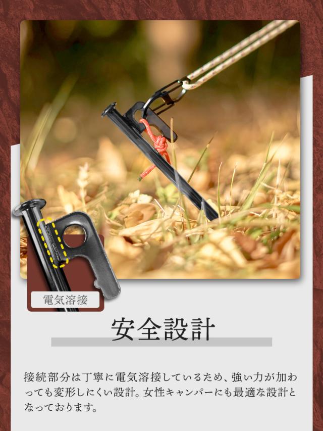 テントやタープの設営に頼れる、強靭なスチール製ペグです。