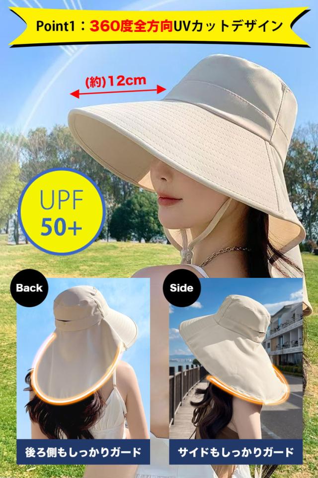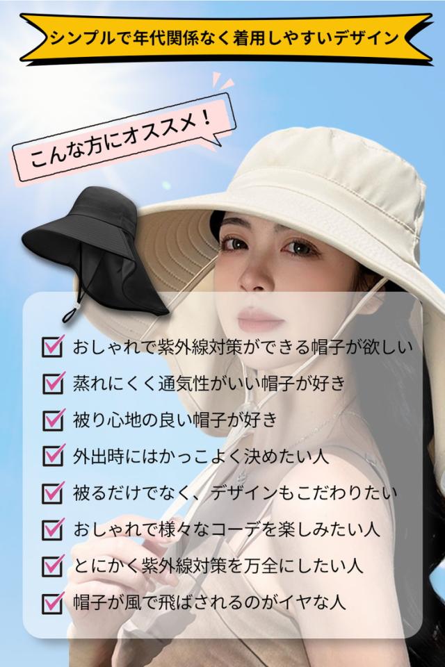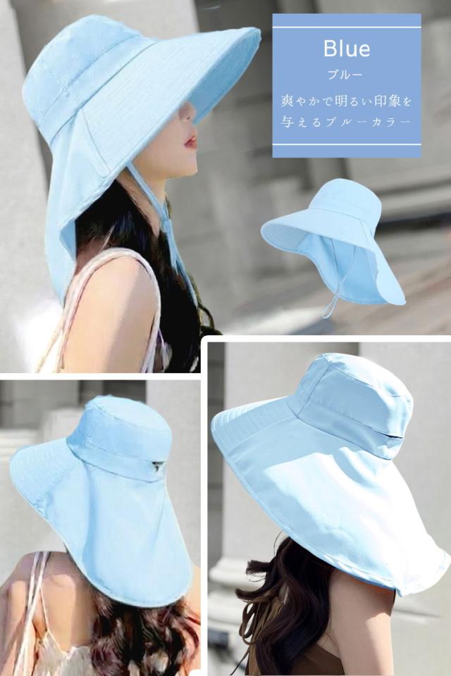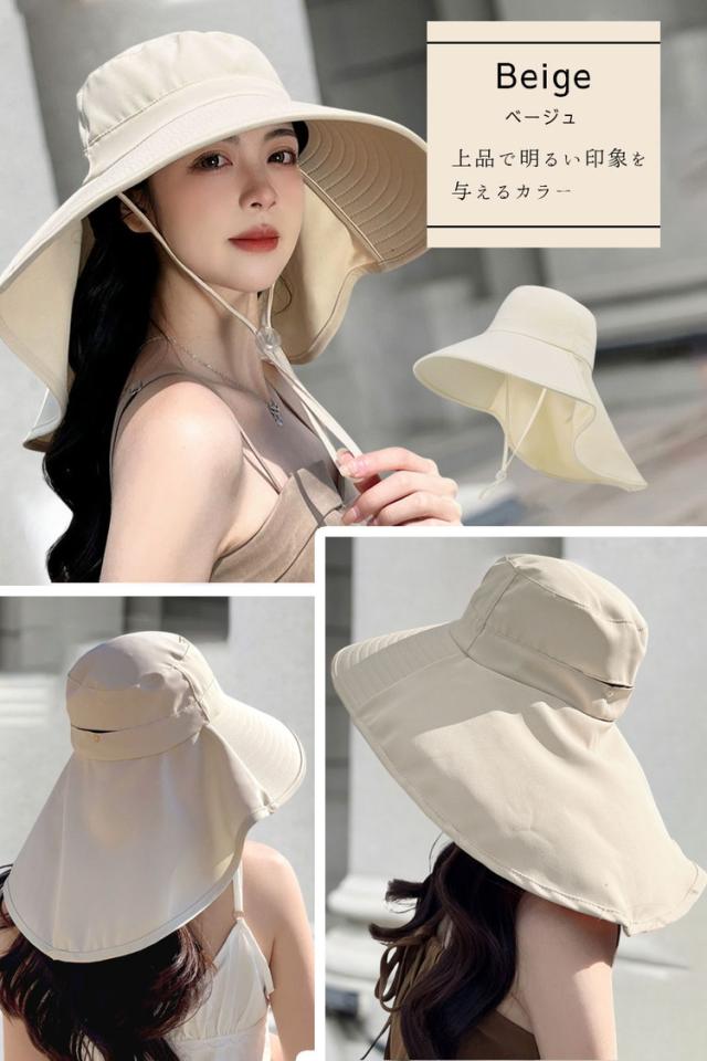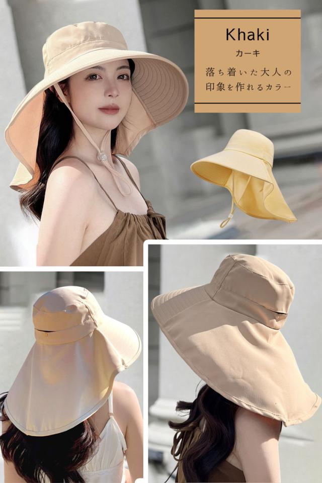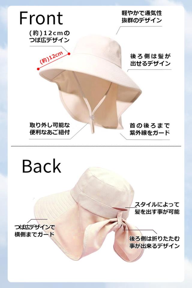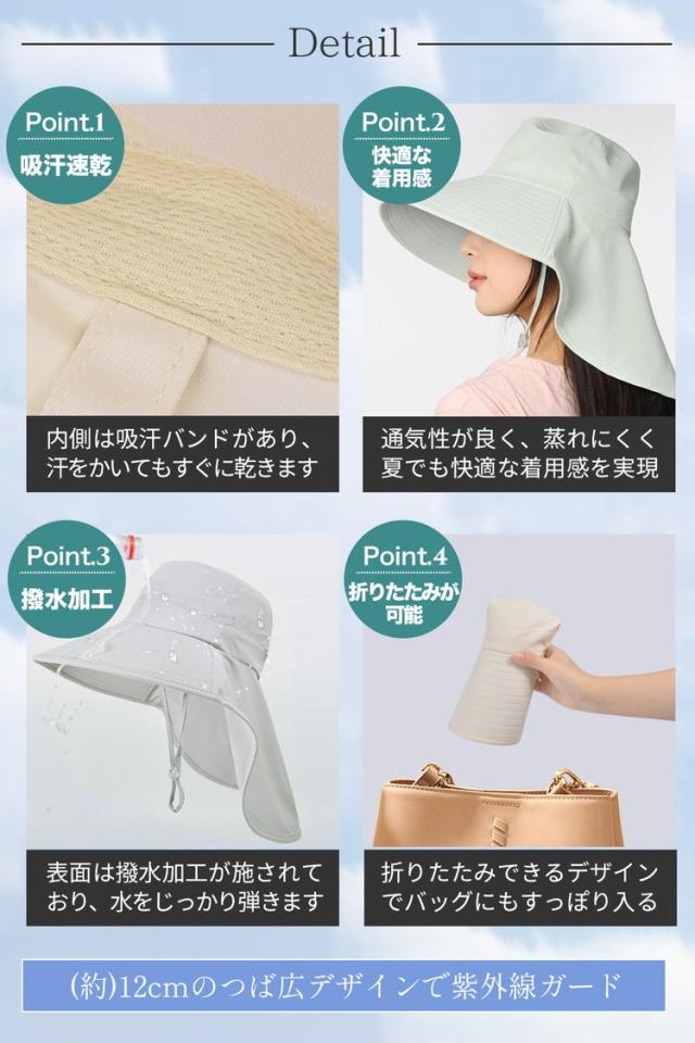 紫外線対策に便利なつば広デザインで、頭から首周りまでガードします