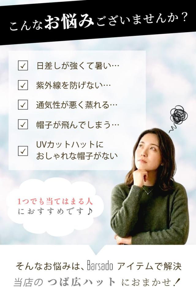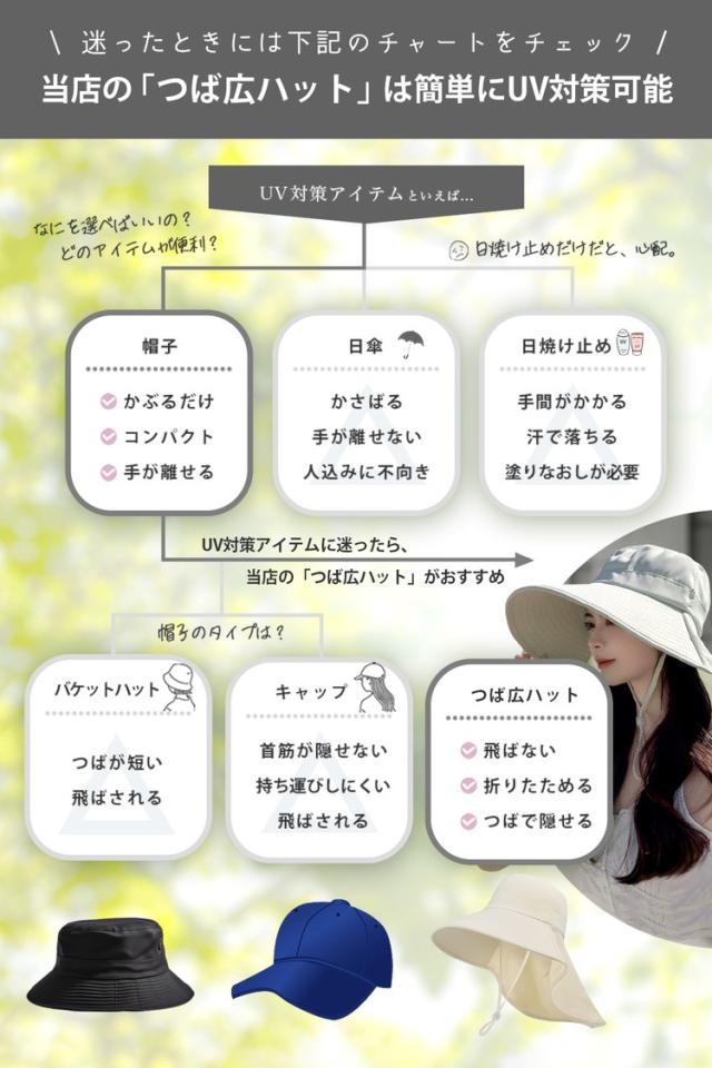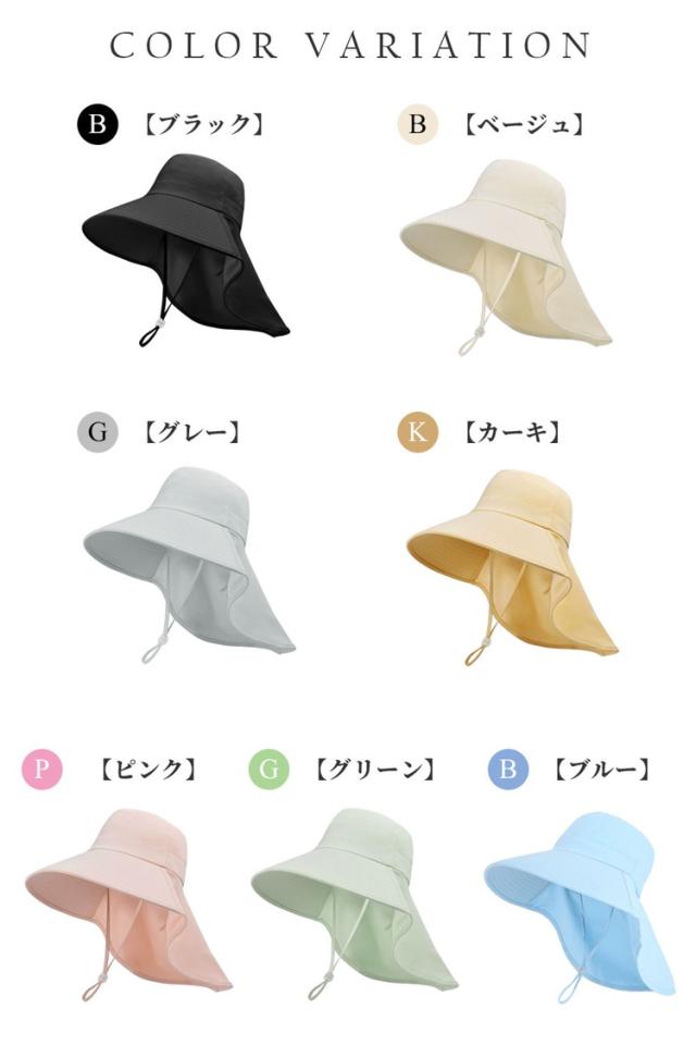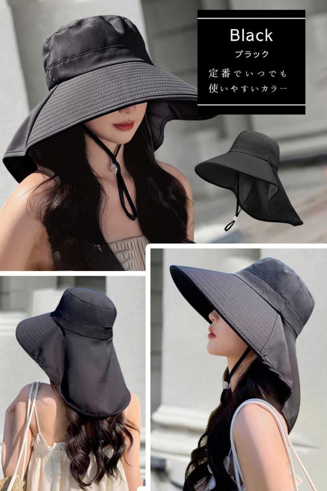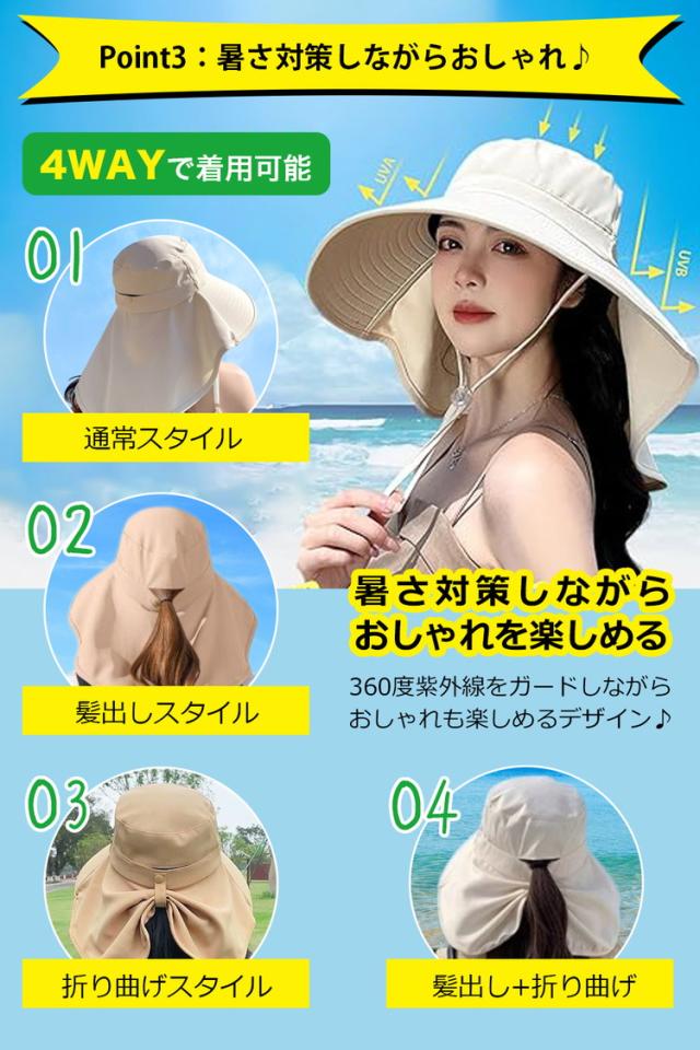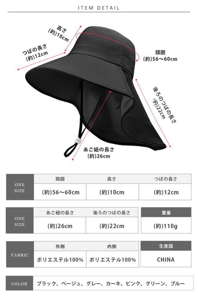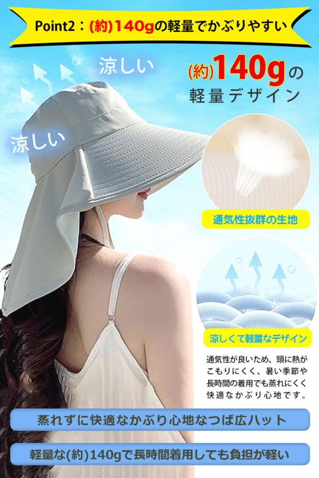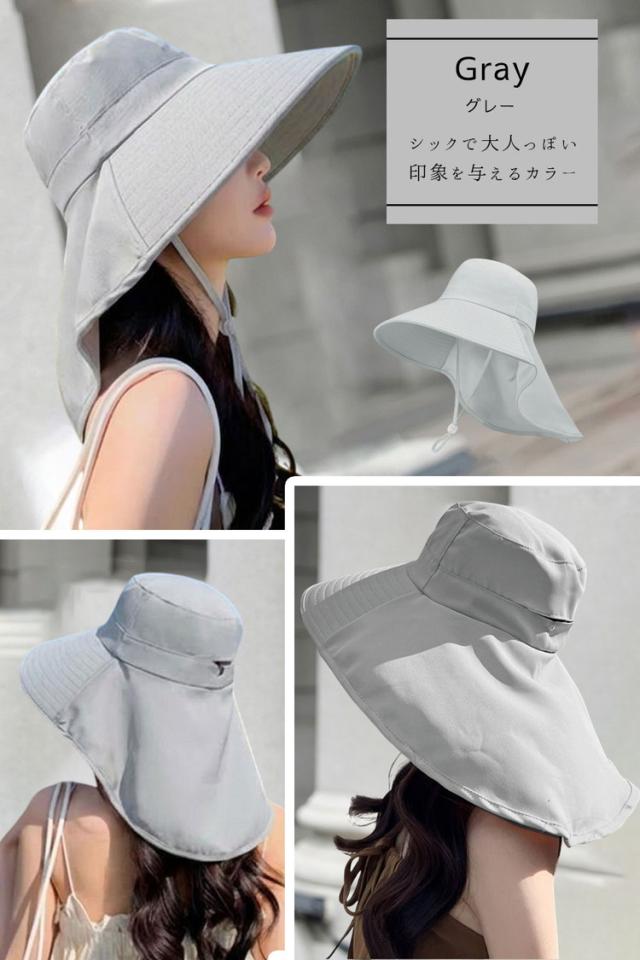 紫外線対策に便利なつば広デザインで、頭から首周りまでガードします
