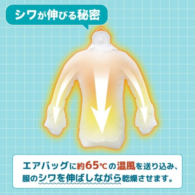 シワを伸ばすハンガー型乾燥機「アイロンいら〜ず」 "ハンガー型"でコンパクトなシワを伸ばす乾燥機です。 生乾き臭が気になる方にもピッタリ! ■サイズ:本体(アーム・エアバック取り付け時):幅1550×奥行130×高さ1000(mm) ■重量:約700g ■電源:AC100V 50/60Hz ■消費電力:620W ■タイマー:15〜180分 ■耐荷重:約5kg ■安全装置:ヒューズ(10A)、温度ヒューズ(121℃)、サーモスタット(85℃)、転倒時安全スイッチ ■材質: 本体:ABS、ナイロン、スチール、PVC アーム:ABS エアバッグ:ポリエステル ■ケーブル長:約180cm ■セット内容:本体、アーム(左右各1本)、エアバッグ、日本語取扱説明書 ※記載は商品仕様の一部です。仕様説明不足等の理由での返品はできません。特に適合等は必ずご確認ください。