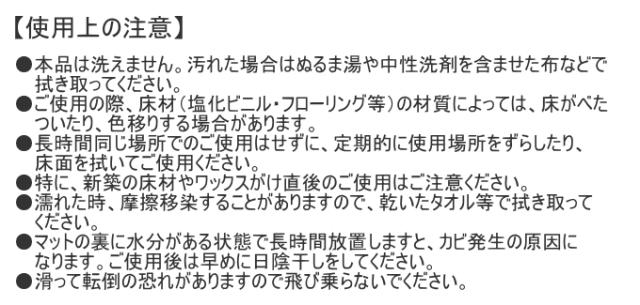 ・丸まった状態でのお届けのため、初めてご使用する際は商品に巻き・折り癖が付いていることがあります。ご使用ごとに巻き・折り癖は目立たなくなっていきます。 ・塩化ビニル特有のにおいが気になる場合は、ご使用前に風通しの良い場所で1日〜2日ほど陰干しされることをおすすめします。 ・床材(塩化ビニル、フローリング等)の材質によっては、床がべたついたり色移りする場合がありますのでご注意ください。 ・長時間同じ場所でのご使用はせず、定期的に使用場所をずらしたり、床面を拭いてからご使用ください。 ・新築の床材やワックスがけ直後のご使用は特に床のべたつきや色移り等にご注意ください。 ・マットが濡れた際に摩擦によって色移りする場合がありますので、乾いたタオル等で拭き取ってください。 ・カビ発生の原因となりますので、マットの裏に水分がある状態で長時間放置しないでください。濡れた場合は早めに日陰干しをしてください。 ・滑って転倒する恐れがありますので、マットの上に勢いよく飛び乗らないでください。 |