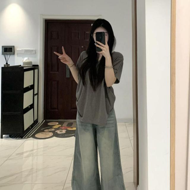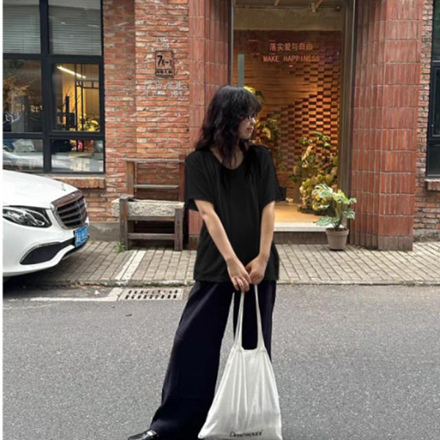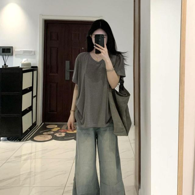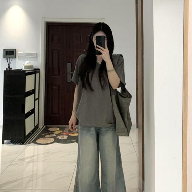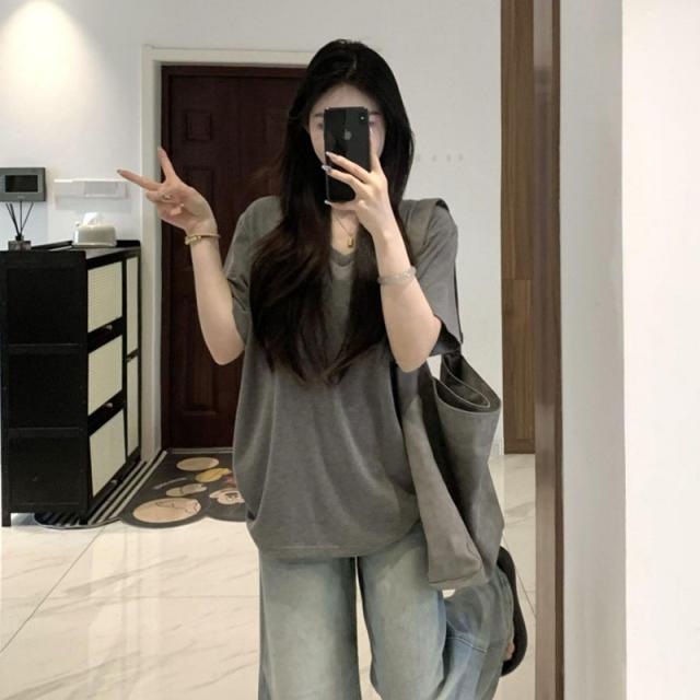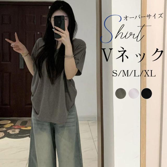 レディース Tシャツ 半袖 Vネック グレー オーバーサイズ ゆるだぼ 垂れ感 カジュアル 韓国風 夏 通勤 普段着 ゆったり 無地 コットン