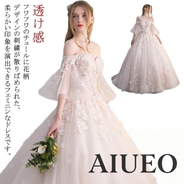 ウェディングドレス オフショルダー 袖あり 編み上げ Aライン フレアスリーブ 花柄レース 透け感 花嫁ドレス フェミニン チュール 二次会ドレス 選べる2タイプ オフホワイト