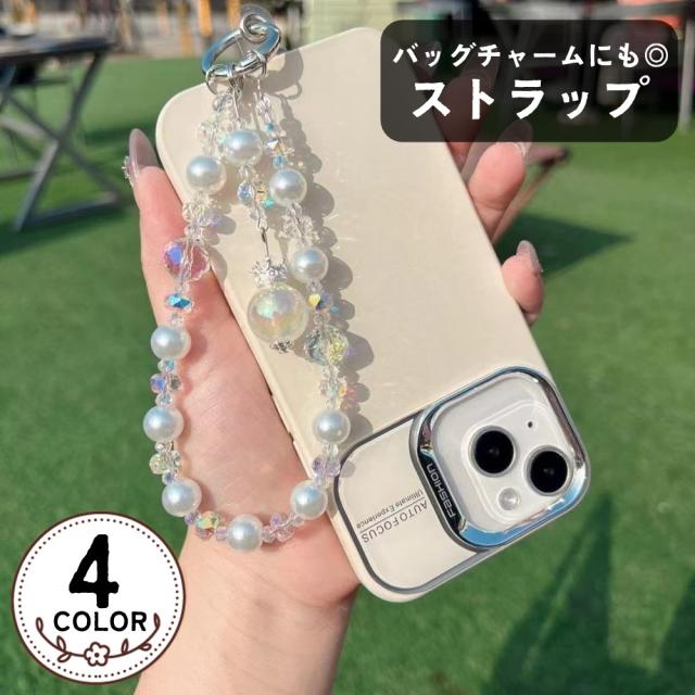 フェイクパールやビーズの飾りが可愛い、スマホストラップ(ストラップホルダー付き)。