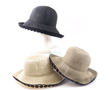 つばの縁にあしらわれた、黒い立体的なフラワーレースがデザインのアクセント