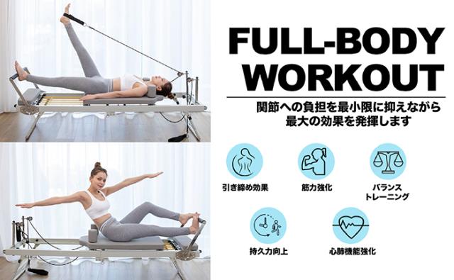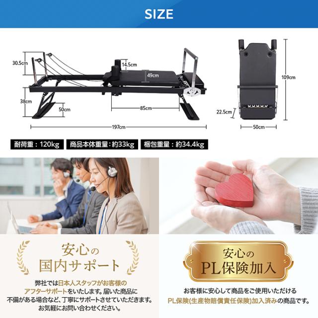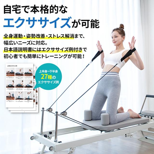 FC展開中の人気ピラティススクールでも採用されている本格リフォーマー。自宅にいながら、ジム級のピラティス体験を実現します。ボディメイクや体幹強化、姿勢改善はもちろん、肩こり・腰痛対策まで幅広くサポート。レベルに応じた負荷調整が可能で、初心者から上級者まで無理なく継続できます。折りたたみ式&キャスター付きで、省スペースかつ移動も簡単。高耐久スチールフレームと滑らかな静音設計により、快適でストレスフリーなトレーニング環境を提供します。日本語説明書とメニュー例付き、さらに国内サポート&PL保険加入で安心。心身のバランスを整え、内側から輝く理想のカラダへ導く、あなたのためのホームジムパートナーです。
