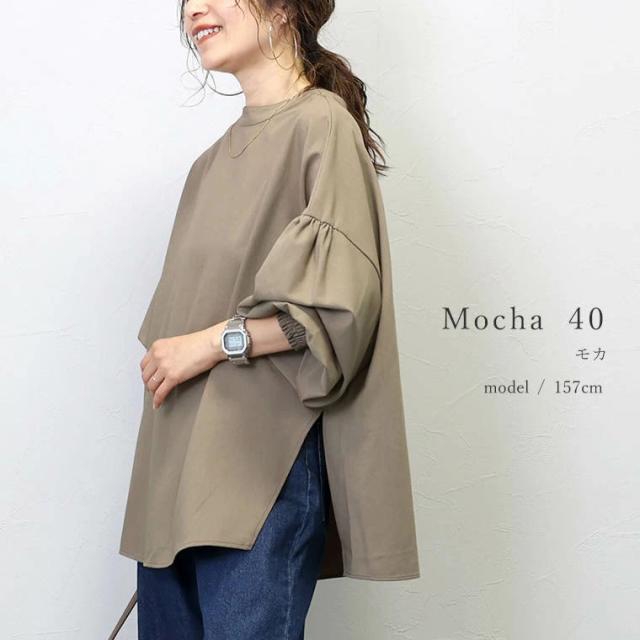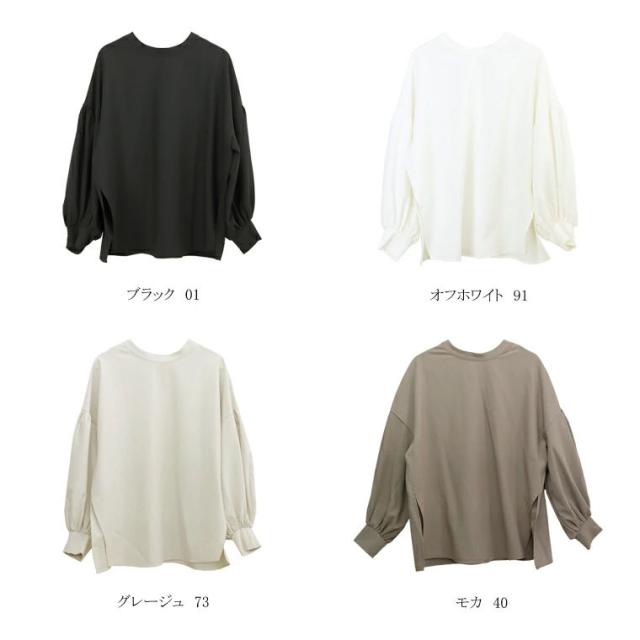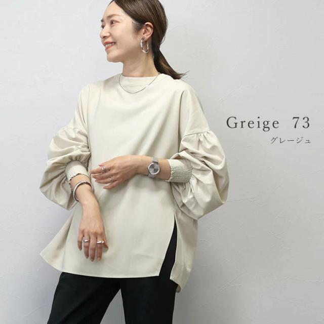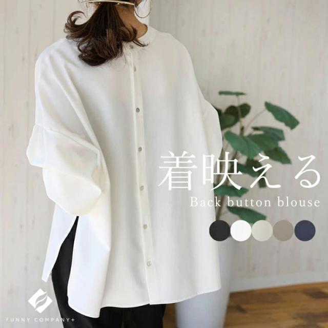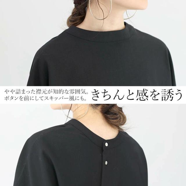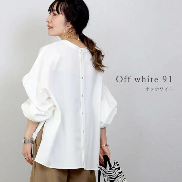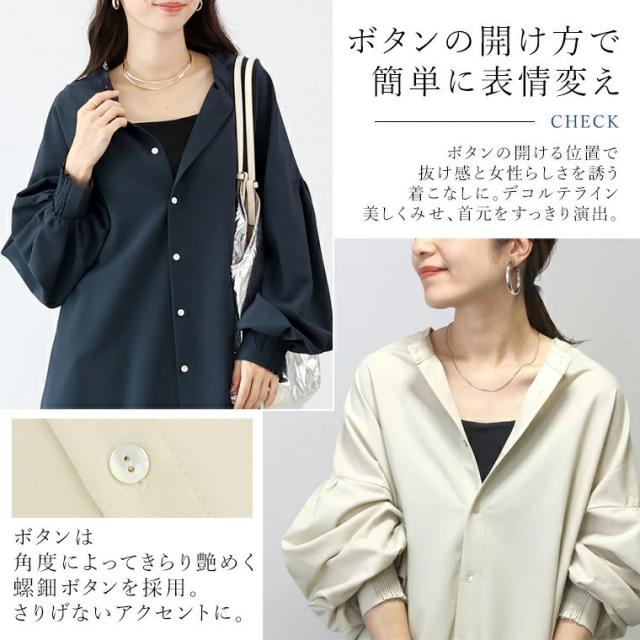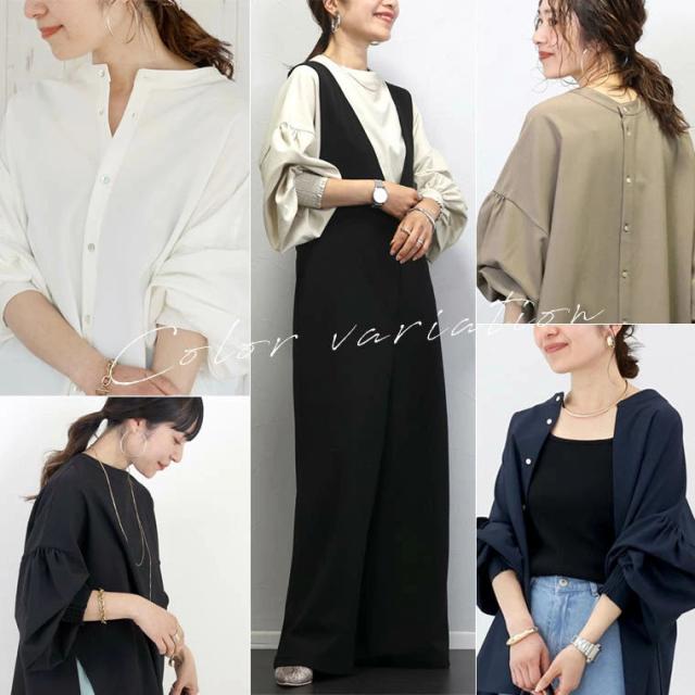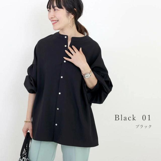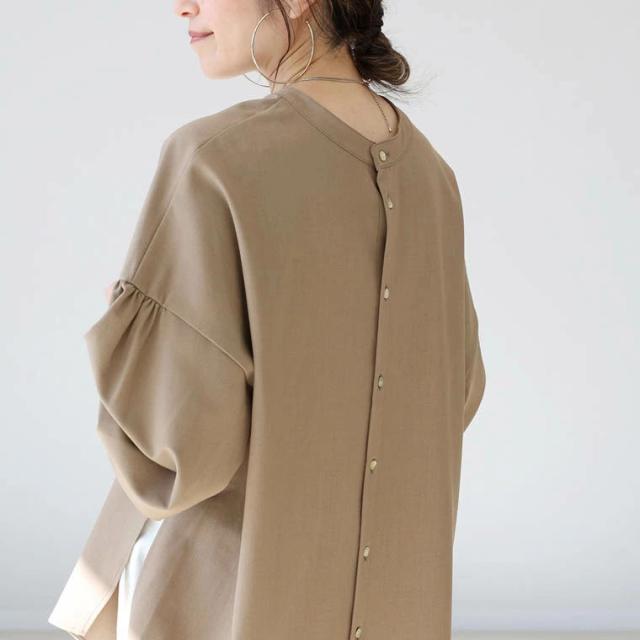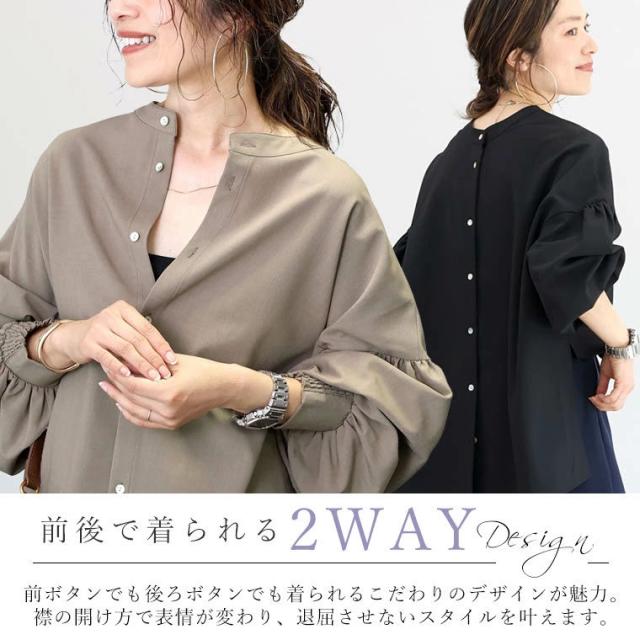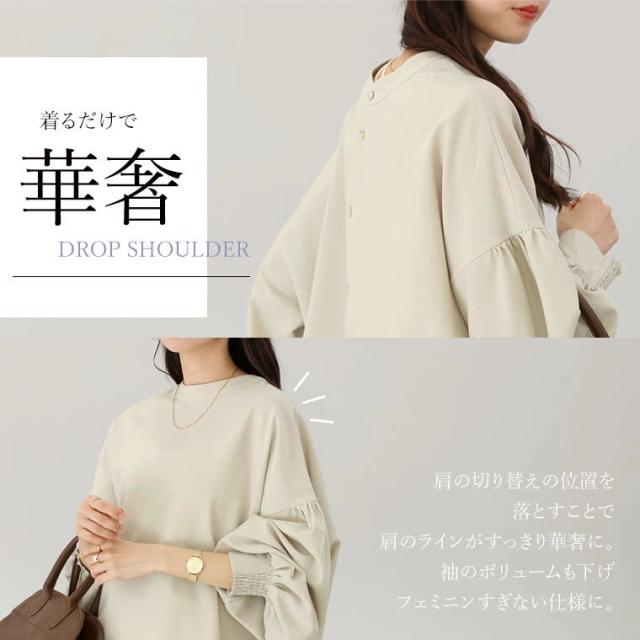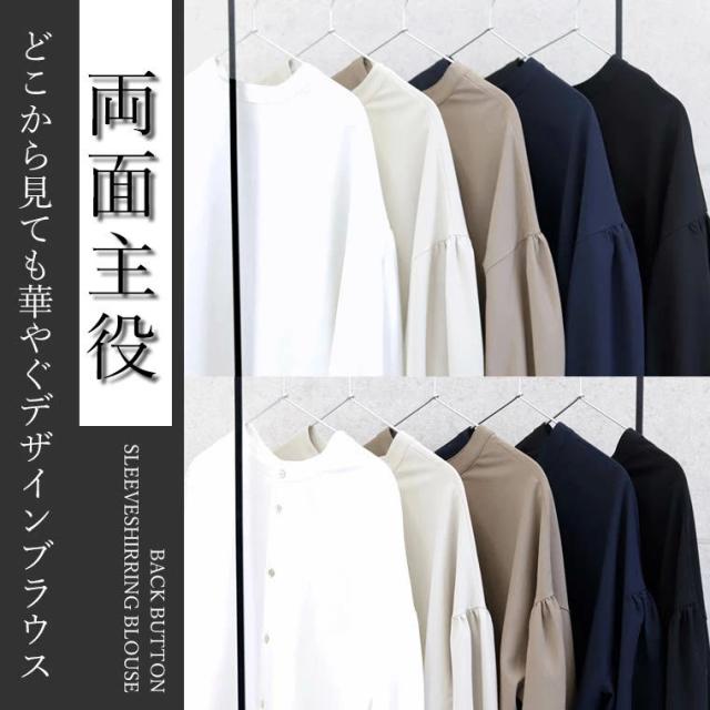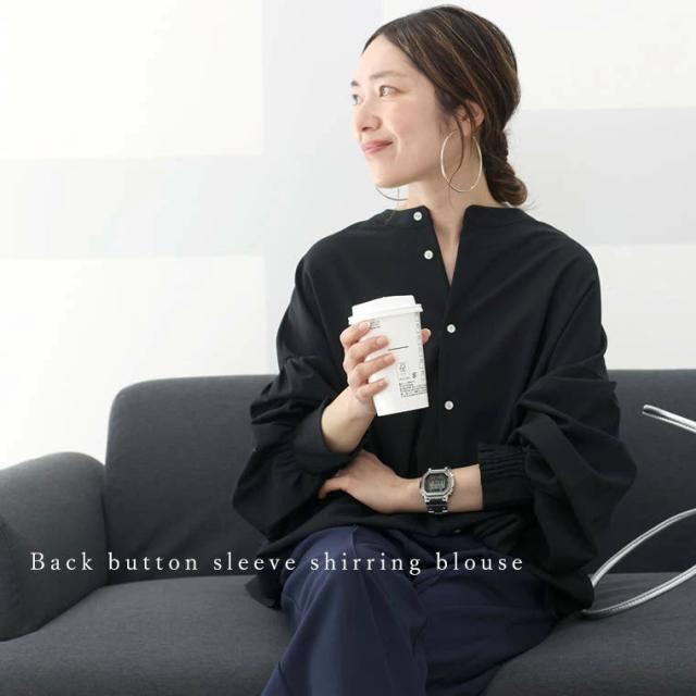 後ろボタン袖シャーリングブラウス ブラウス 後ろボタン シャーリング バンドカラー スキッパー 2way きれいめ 大人 スリット レディース