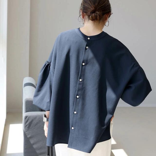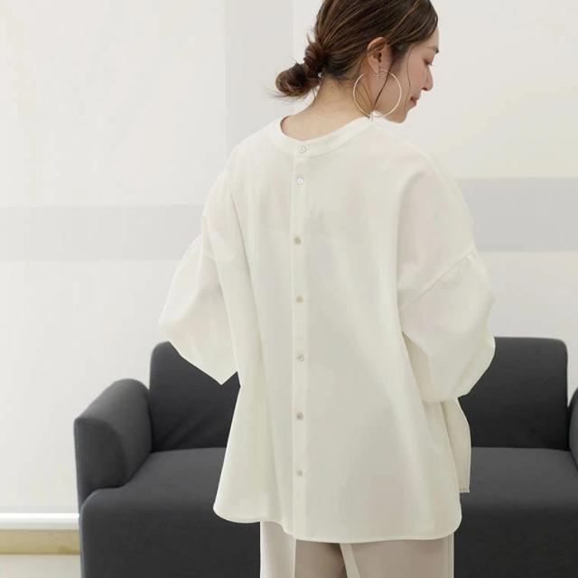 着映え感も着回し力もおすすめのオリジナルブラウスの登場。後ろボタン、バンドカラー、袖シャーリングなど人気のディテールを集約し、360度どこからみても魅力満載。さらに前後2way仕様にし、着回しのパターンも加えました。きちんと見えするバンドカラーは、ボタンを前に襟の開きをお好みで調節することでスキッパー襟も楽しめます。ほどよいボリュームが可愛いぽわん袖もポイント。袖口のシャーリングが女性らしいアクセントとなり、腕まくりもしやすいので日常の動作にストレスを与えません。大人のきれいめスタイルに着回しやすい、ベーシックなカラー展開です。