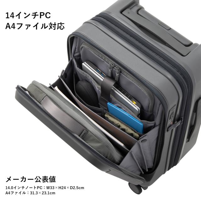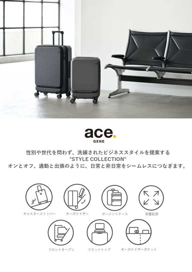 | 性別や世代を問わず、洗練されたビジネススタイルを提案する「STYLE COLLECTION」から誕生したスーツケース。 通勤や出張、日常から旅先まで、オンとオフをシームレスにつなぐ次世代ラゲージです。 双輪キャスターやエキスパンダブル機能を備え、移動時の快適性と実用性を追求。 さらに衣類の仕分けができるオーガナイザーパネルやガーメントケースを付属し、ビジネスシーンにも対応する機能性を備えています。 ● 機内持ち込みサイズ 2〜3日の旅行向け。 国内線・国際線100席以上の航空機に対応した機内持ち込みサイズです。 ● フロントポケット PCや書類、チケットなどを整理して収納できるフロントポケットを搭載。 14.0インチノートPCやA4ファイルの収納に対応しています。 14.0インチPC 参考収納サイズ:W33×H24×D2.5cm A4ファイル 参考収納サイズ:31.3×23.1cm ● ドキュメントオーガナイザー フロントポケット内部には書類の整理に便利な蛇腹式ポケットを装備。 ● コンパクトガーメントケース 衣類の仕分けや収納に便利なインナーケースが付属。 ガーメントケースサイズ:H39×W28×D2cm ● オーガナイザーパネル ジャケットなどの衣類を巻きつけて収納でき、ホテルではハンガーに吊るして使用可能。 ● フラットトップルーフ トップハンドルの出っ張りを抑え、本体上部をフラットに設計。 PC作業時などにテーブル代わりとしても使用できます。 ● キャスターストッパー 不意な走行を防ぐキャスターストッパーを搭載。 ● エキスパンダブル 荷物量に応じてマチ幅を拡張できる容量拡張機能。 ● 双輪キャスター 旋回性に優れ、スムーズな方向転換を可能にするHINOMOTO製キャスター。 ● プルドライブハンドル 身長やシーンに合わせて4段階の高さ調整が可能。 ● TSダイヤルファスナーロック Travel Sentry認可のTSダイヤルロックを搭載。 施錠したまま空港で預け入れができ、海外旅行でも安心です。 ■収納機能 ・フロントポケット(PCスリーブ) ・オープンポケット×2 ・メッシュオープンポケット×1 ・ドキュメントオーガナイザー×1 ・内装オープンポケット×2 ・オーガナイザーパネル(マチ付きファスナーポケット×2) ace. / エース 「ace.」の製品は最適形状、最適デザインをプロダクトのコンセプトとし日本の美意識を感じるデザインであり日本人の琴線に触れ世界を魅了するデザインとなっています。ディメンションやポケットの配置や位置関係など白銀比を手がかりにしたデザイン、日本特有の自然美や造形美や機能美などからインスピレーションを受けデザインしています。 GENE LABEL / ジーン レーベル ビジネスシーンでの快適性を追求するビジネスバッグや出張対応トローリーバッグを中心としたビジネスカテゴリーのレーベルです。 |