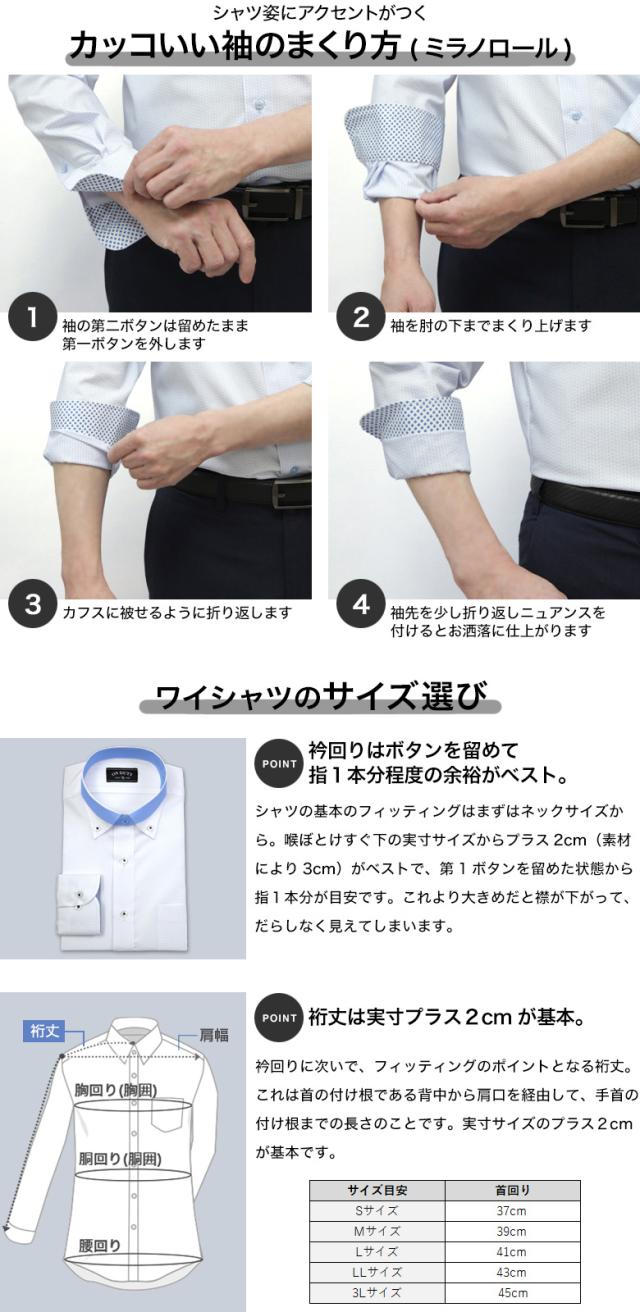| サイズはお客様の首回りの実寸値より、プラス2cm〜3cmの襟回りのシャツが目安となります。 またはお手持ちのドレスシャツの襟回りサイズをご確認ください。 |