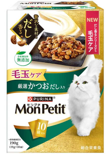 まぐろ、かつおなど、お魚のおいしさがぎゅっと詰まった粒に、厳選した2種のかつお出汁をブレンド。天然の食物繊維を配合し、体内の毛玉を自然に排出するように配慮。合成着色料無添加。