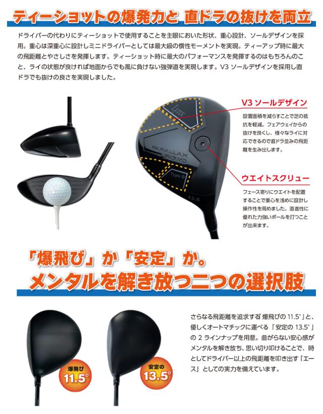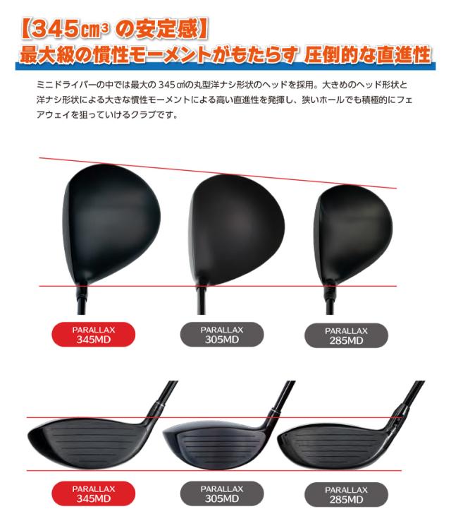 もう1Wはいらない?曲がらない安心感が「最大飛距離」を引き出す最強のミニドラ爆飛びの11.5°と安定の13.5°選べる二つの直進弾道パララックスシリーズからティーアップ時の飛距離、コントロール性能をコンセプトにしたミニドライバーPARALLAX345MDが誕生。305MDに比べ大きめの345cm3ヘッドを採用し、パララックスシリーズの中では最大の慣性モーメントによる圧倒的な優しさを実現。345cm3の安定感最大級の慣性モーメントがもたらす圧倒的な直進性ミニドライバーの中では最大の345cm3丸形洋ナシ形状のヘッドを採用。大きめのヘッド形状と洋ナシ形状により大きな慣性モーメントによる高い直進性を発揮し、狭いホールでも積極的にフェアウェイを狙っていけるクラブです。ティーショットの爆発力と直ドラの抜けを両立ドライバーの代わりにティーショットで使用することを主眼においた形状、重心設計、ソールデザインを採用。重心は深重心に設計しミニドライバーとしては最大級の慣性モーメントを実現。ティーアップ時に最大の飛距離とやさしさを発揮します。ティーショット時に最大のパフォーマンスを発揮するのはもちろんのこと、ライの状態が良ければ地面からでも風に負けない強弾道を実現します。V3ソールデザインを採用し直ドラでも抜けの良さを実現しました。「爆飛び」か「安定」か。 メンタルを解き放つ二つの選択肢さらなる飛距離を追求する「爆飛びの11.5°」と、優しくオートマチックに運べる「安定の13.5°」の2ラインナップを用意。曲がらない安心感がメンタルを解き放ち、思い切り叩けることで、時としてドライバー以上の飛距離を叩き出す「エース」としての実力を備えています。