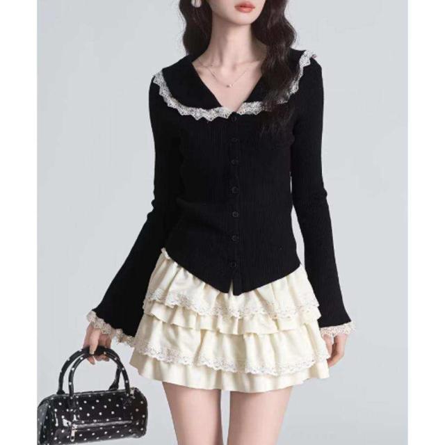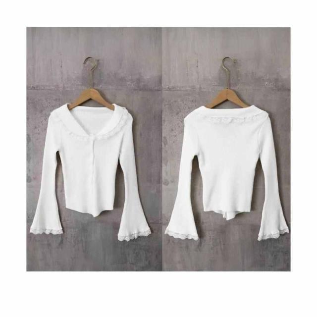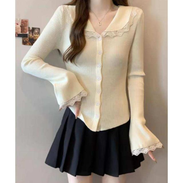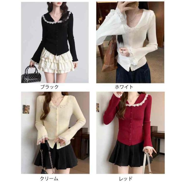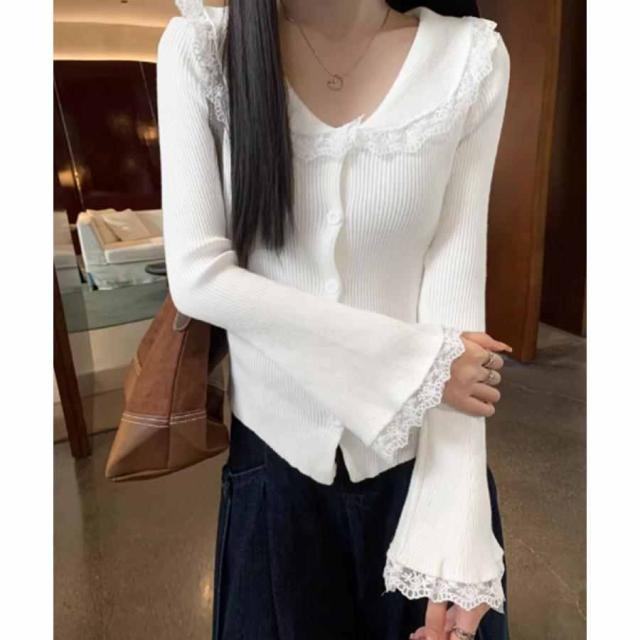 レディース ニットカーディガン 大人可愛い 春秋トップス 長袖フレア袖トップス フェミニン 前開きトップス デコルテ見せ