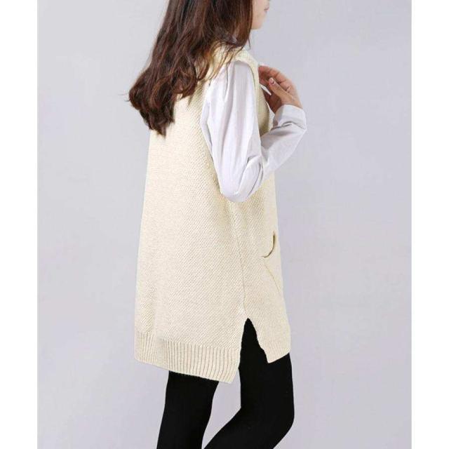 レディース サイドスリット ニットチョッキ ポケット付き ロングニットベスト 重ね着 無地ベスト カジュアル ニットジレ