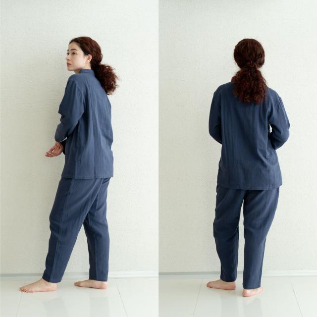 前開き仕様で着脱がしやすく、ゆったりとした長袖デザインはお部屋でのくつろぎ時間にもぴったり。シンプルでおしゃれなルームウェアとしても活躍します。