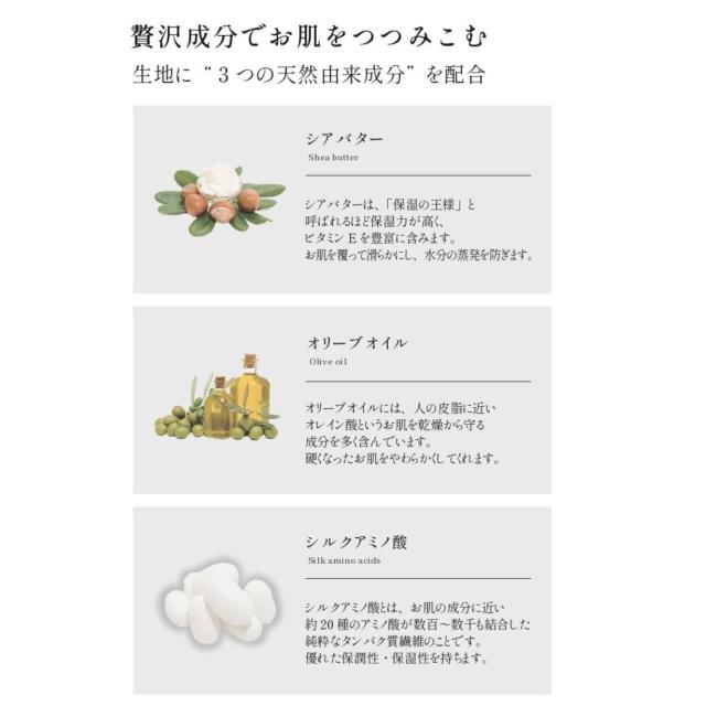 生地にはシアバター、オリーブオイル、シルクプロテイン由来のアミノ酸を配合。オリーブオイルは人の皮脂に近い成分で、オレイン酸を豊富に含み、乾燥から肌を守ります。アルギニンやグルタミンを含むシルクアミノ酸は、湿潤性・保湿性に優れ、しっとりとした着心地をサポート。