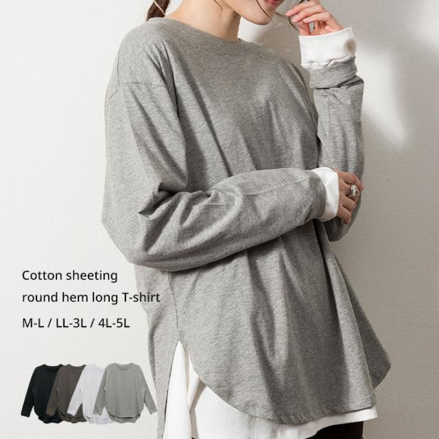 天竺ラウンドヘムロンTシャツ 綿 トップス 長袖 無地 ゆったり レディース 0423