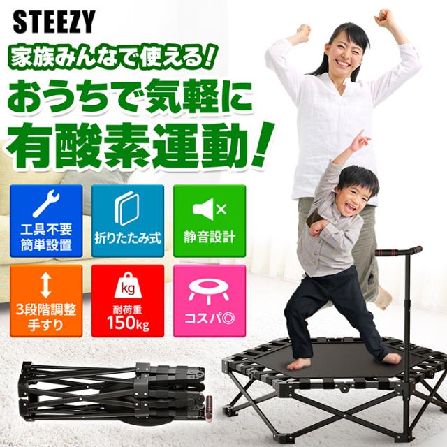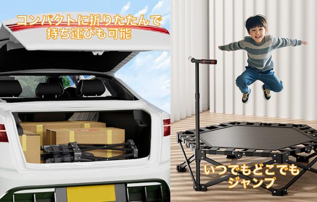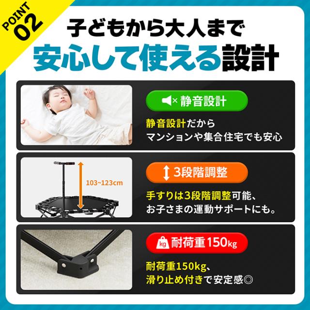 トランポリン 室内 子供 大人 折りたたみ かんたん設置 手すり コンパクト 静音 安全ゴムバンド式 国内企画 省スペース 大人 子供兼用 工具不要 耐荷重150kg 高さ調整 静音 ダイエット エクササイズ