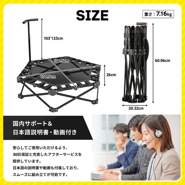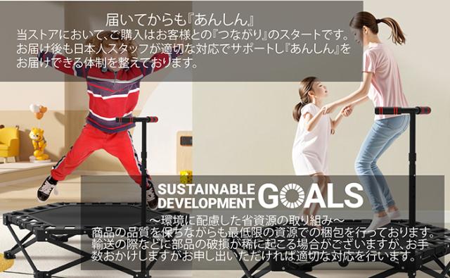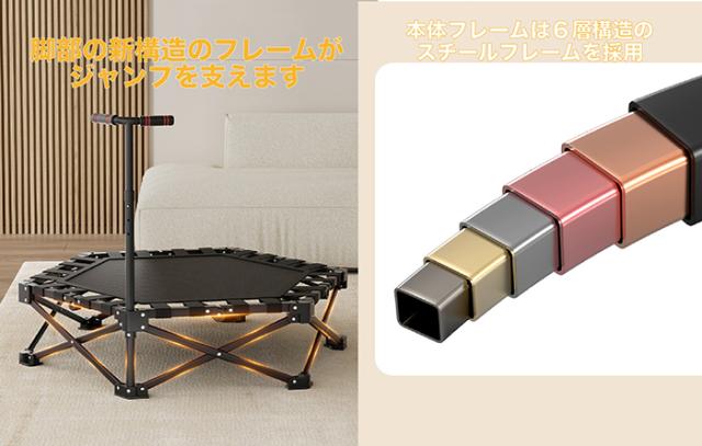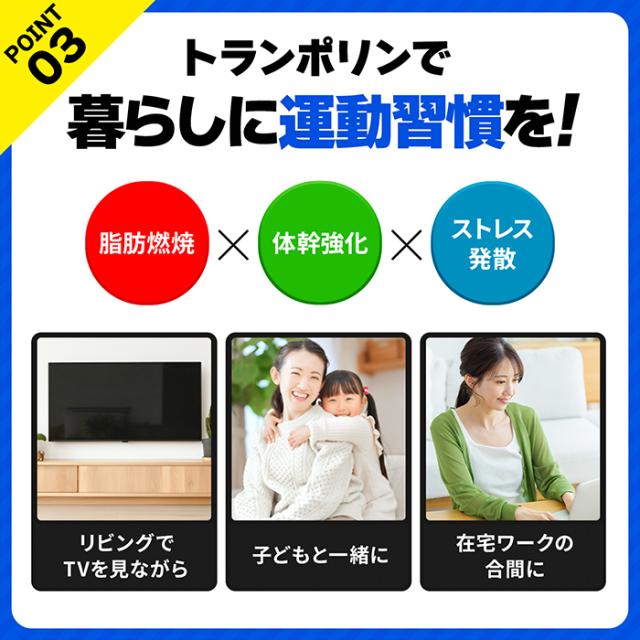 工具不要ですぐに使える新型トランポリン♪箱から取り出して広げ、手すりを取り付けるだけで準備完了。女性や初心者でも簡単に設置でき、家族みんなで日常的に楽しく運動できます。使わない時は折りたたんで隙間へスッキリ収納できる省スペース設計で、プレゼントにも最適。静音設計を採用し、高品質ゴムで静かに跳べるため、集合住宅でも安心です。付属の手すりは3段階で高さ調整ができ、子どもから大人まで安全に使用可能。新構造フレームにより耐荷重150kgを実現し、高い安定性を確保。1日5分の利用でジョギング約1km分のカロリー消費が期待でき、天候に左右されず脂肪燃焼や体幹強化、ストレス解消に効果的です。さらに国内スタッフによるサポート体制とPL保険加入で、万が一のトラブル時にも安心して利用できます。
