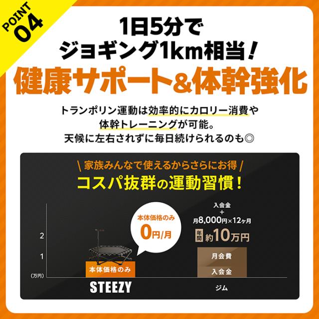 【健康サポート&体幹強化】 新構造のフレームと脚部の滑り止めパッドで150kgの耐荷重と安全性を両立♪1日5分のトランポリン運動でジョギング1km相当のカロリーを消費し、天候不良でも脂肪燃焼やストレス解消に効果的♪