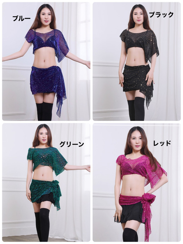 ベリーダンスレッスン用衣装 2点セット(非対称トップス+ヒップスカーフ)光沢素材 エレガントデザイン