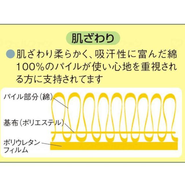 パイル生地ならではのふんわりとした感触で、直接肌に触れても違和感が少なく、吸汗性にも配慮されています。