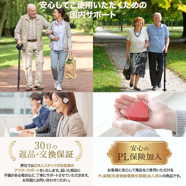 歩く力と休む安心を両立したステッキチェアは、歩行を支える杖として使えるだけでなく、疲れた時にはサッと座って休憩できる頼れるアイテムです。推奨身長は155〜175cm軽量で丈夫なアルミ素材を採用し、重さは約720gとビニール傘2本弱ほど。専用収納ケース付きで持ち運びや旅行にも便利です。折りたたみ操作が簡単で、どこでも広げて使えるため外出の自由が広がります。快適な歩行と一休みをサポートし、毎日の外出をより楽しく安全に。敬老の日や誕生日、記念日のプレゼントにも最適です。購入後は日本人スタッフによる国内サポートが受けられ、PL保険(生産物賠償責任保険)にも加入済み。安心して使える品質とサポート体制が整っています。