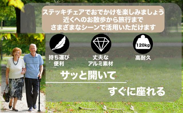 このステッキチェアがあれば、疲れ知らずの快適な歩行とひと休みが叶い、あなたのアクティブライフを強力にサポート♪外出の安心感を手にしましょう!