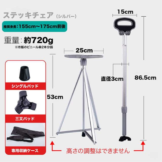 歩行をしっかりサポートする杖機能に加え、疲れた時にはサッと座れる椅子としても使える、まさに“あなたの頼れる相棒”です♪💡推奨身長155〜175cm前後※ステッキの高さの調整はできません。