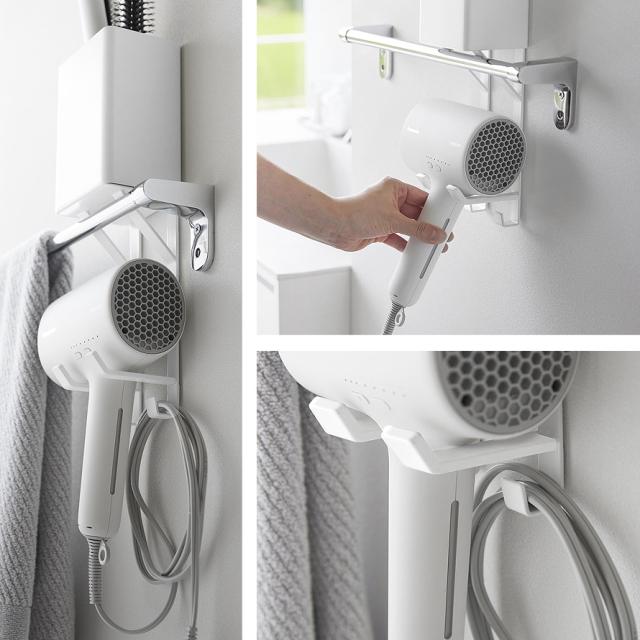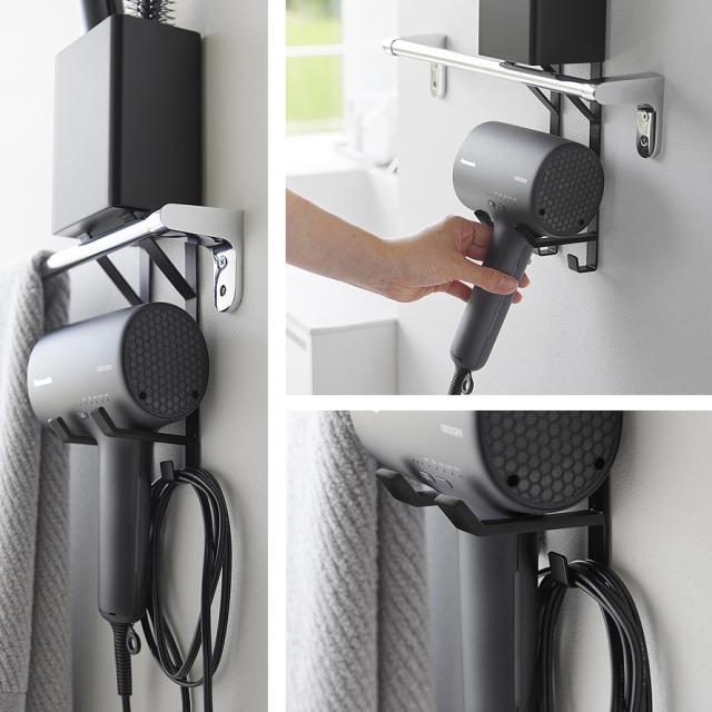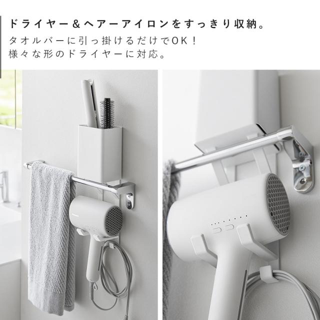 ドライヤーやヘアーアイロンを、タオルバーに載せるだけで一括収納できるホルダーです。ドライヤーは引っ掛けて収納する構造のため、さまざまな形状に対応します。