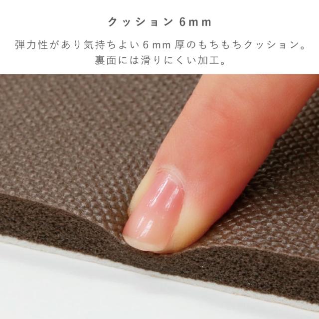 6mm厚のもちもちマットでクッションが足に心地いい。程よい厚みとクッション性のあるソフトな踏み心地で、長時間の立ち仕事による足への負担を軽減します。