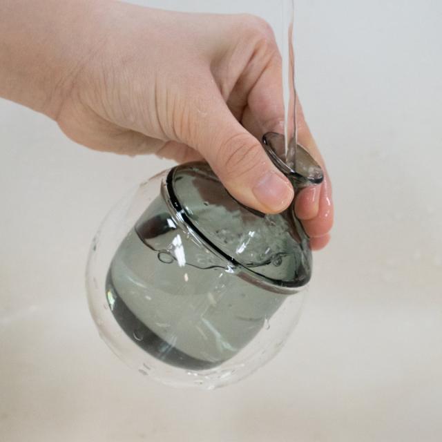 指にフィットして持ちやすいデザインのため、洗う際も安定してしっかり握れます。ガラス素材なので、飲み物のにおいや色移りがしにくく、さっと洗うだけで清潔感をキープ。毎日気持ちよくお使いいただけます。