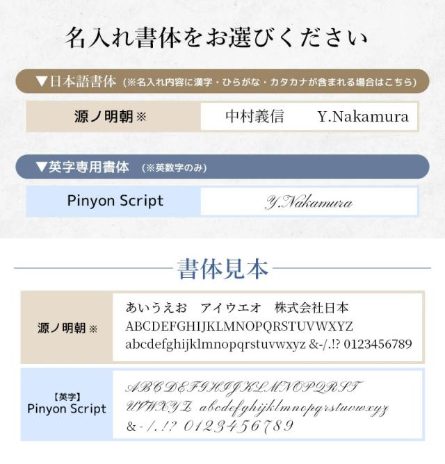 ■スペース(空白)も文字数に含みます。 ■ローマ字のみ対応可能なフォント(Pinyon Script)を選択し、日本語(漢字・ひらがな・カタカナ)ご記入の場合、フォント源ノ明朝で刻印いたします。 ■刻印内容ご入力いただいた内容で刻印作業となります。そのままコピーペーストし刻印作業致します。誤字と脱字の修正いたしません。 ■旧字体でご注文の場合、お客様のPCで表示されている場合でも、PCの環境によって文字化けする可能性がございます。 ■刻印フォント名入れ無しを選択し、刻印内容ご記入の場合、書体お任せで刻印いたします。 ■刻印内容(文字数)により、文字の大きさを調整し刻印いたします。 ■他者の権利を侵害するデザインなど、内容によってはご注文をお受けできない場合があります。 ■刻印作業状況により仕上がりに差が出ることがあります。予めご了承ください。 |
