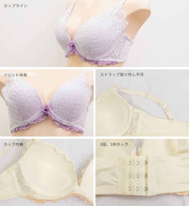 | 【カップタイプ】3/4カップ・モールドカップ(丸みを形成した厚みのあるカップです)、【ホックの数】3段3列、【パット付属】なし、【パットポケット】なし、【ストラップ取外し】不可、【ワイヤー】あり、※タンブル乾燥禁止 |