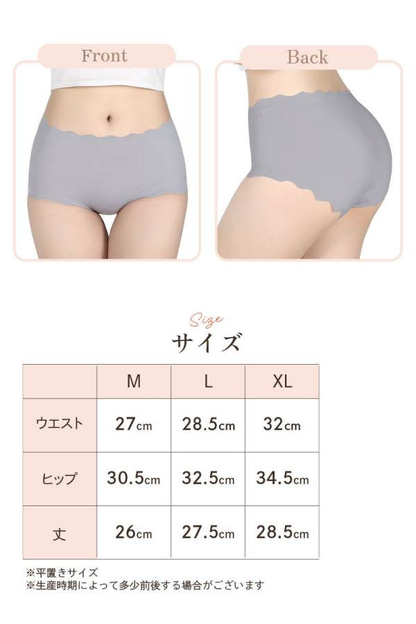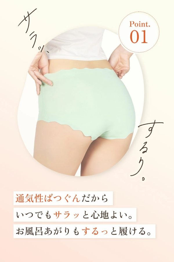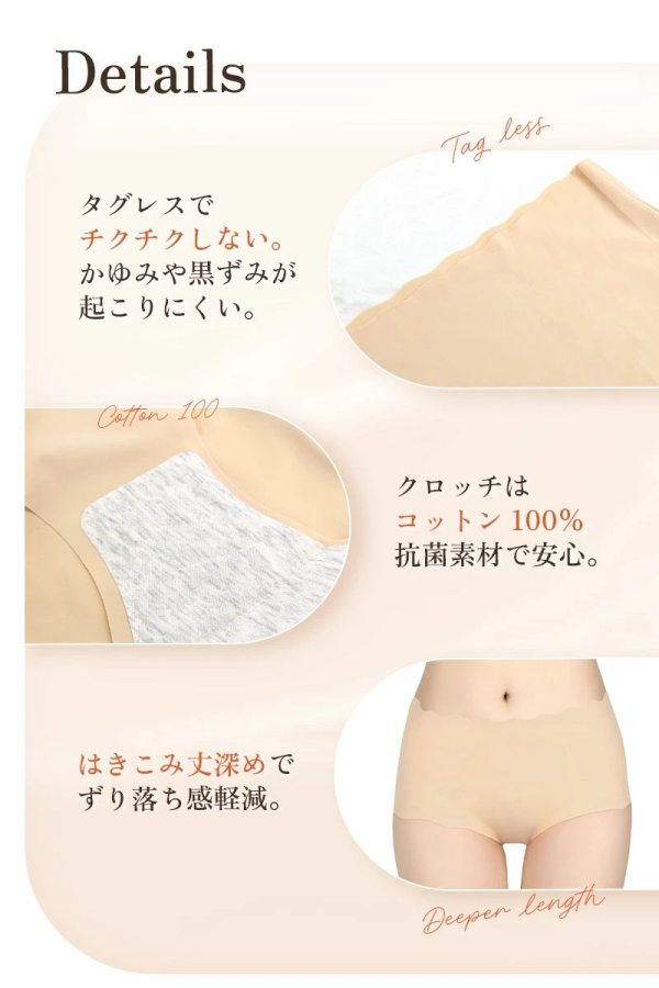- 肌にあたるステッチ部分を同色になり、生地はサラサラで柔らかく、履いてみると履いてないような軽やかさがありとても履きやすかったです。 縫い目がないので、ぴったりとしたパンツにもショーツの跡がひびかず、とても重宝しています。