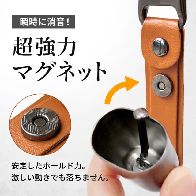 【超強力マグネットで瞬時に消音】 消音機能は、超強力マグネットを採用。建物に入る際や人混みでは、片手でサッと鈴を固定するだけでピタッと音が止まります。