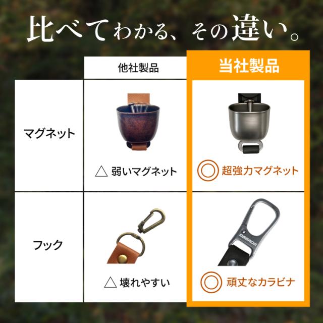 落ち着いたデザインと高級感のあるPUレザーは、アウトドアギアとしてはもちろん、日常のバッグに付けても違和感なく馴染みます。