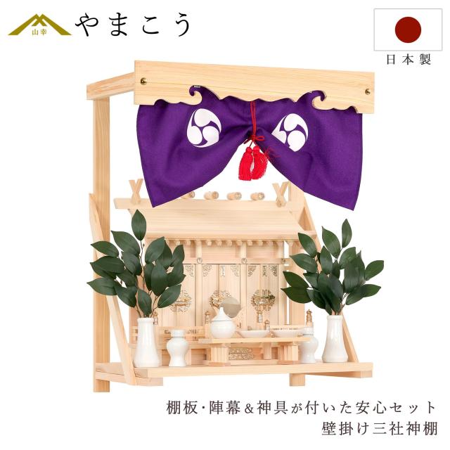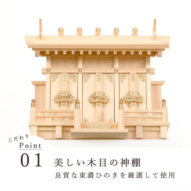 神棚 岐阜 東濃ひのき 工房謹製 通し屋根三社 特小 白無地 神具セット 棚板 神幕セット 付き 横幅 約39.5cm 真鍮金具 本金具 通し屋根 三社 コンパクト 国産 高級 桧