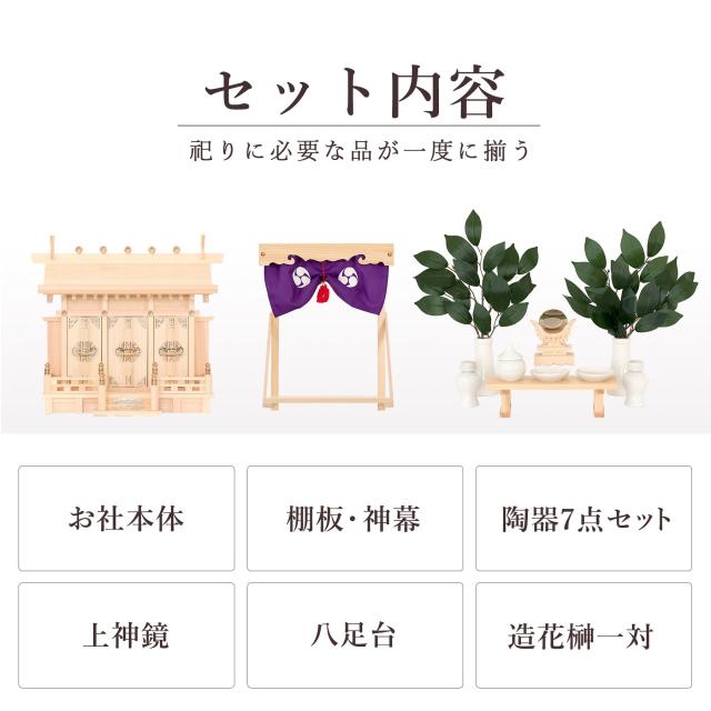 ・お社本体 ・棚板 小 神幕セット付 ・白無地神具 7点セット 小(榊立てx2、平次x2、水玉、皿x2) ・上神鏡 1.5寸 ・八足台 ・造花榊 |