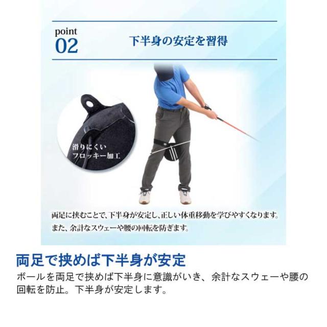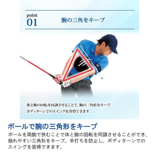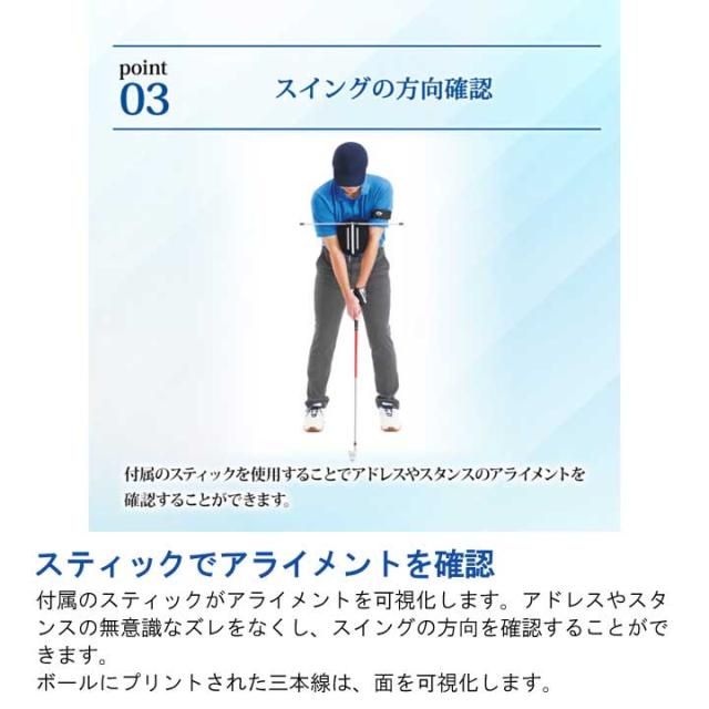 空気を入れて膨らましボールを両腕で挟みながら胸に当てることで、体と腕の回転を同調させ、腕の三角形をキープ・意識したボディターンでのスイングを習得できます。また、両足に挟むことで下半身が安定し、余計なスウェーや腰の回転を防ぎます。付属のスティックを使用することで、アドレスやスタンスのアライメントを確認することができ、”1つ3役”で理想のスイングが身につきます。