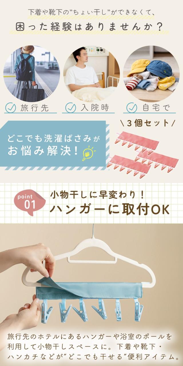 ハンガー、物干しやポールなどにくるっと巻き付けて使える、携帯洗濯ばさみの3個セットです。面ファスナーで簡単に取り付けできるので、雨天時の部屋干しはもちろん、ホテルや入院時、旅行や出張先でも手軽に干す場所を増やせます。折りたたみできるコンパクト設計で、使わない時もかさばりにくく、持ち運びにも便利です。