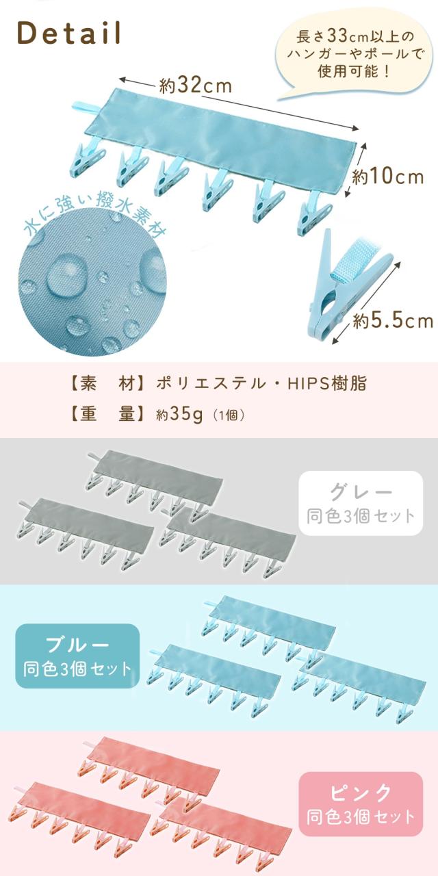 1つあたり6ピンチ付きで、靴下、ハンカチ、下着、手袋などの小物をまとめて干しやすい仕様です。限られたスペースでも使いやすく、洗濯物をすっきり吊るせるのが魅力。梅雨時や干す場所が少ないご家庭でも取り入れやすく、一人暮らしの方や省スペースで洗濯したい方にも便利です。