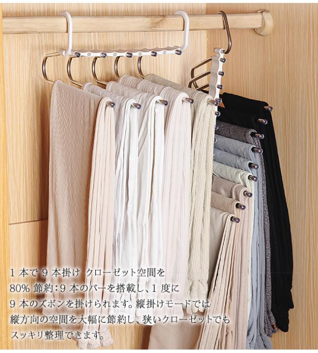 1 本で 9 本掛け クローゼット空間を 80% 節約:9 本のバーを搭載し、1 度に 9 本のズボンを掛けられます。縦掛けモードでは縦方向の空間を大幅に節約し、狭いクローゼットでもスッキリ整理できます。