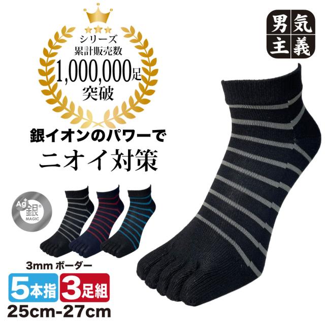 靴下 五本指ソックス メンズ 3足組 銀マジック 895 3ミリボーダー スニーカー丈 抗菌 防臭 消臭 蒸れない 25-27cm カジュアル 紳士 綿混 セット くるぶし 五本指 丈夫
