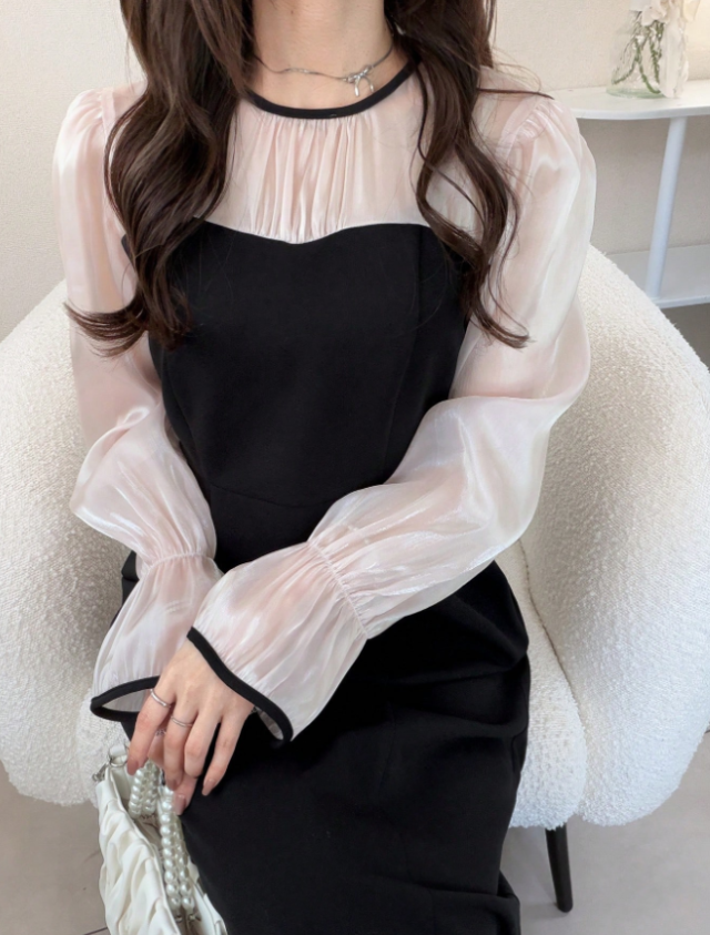 アプリコット アシメネック ロングワンピース【コントラストメッシュ×フレアスリーブ/エレガントスタイル】