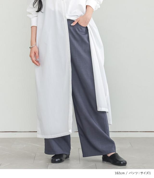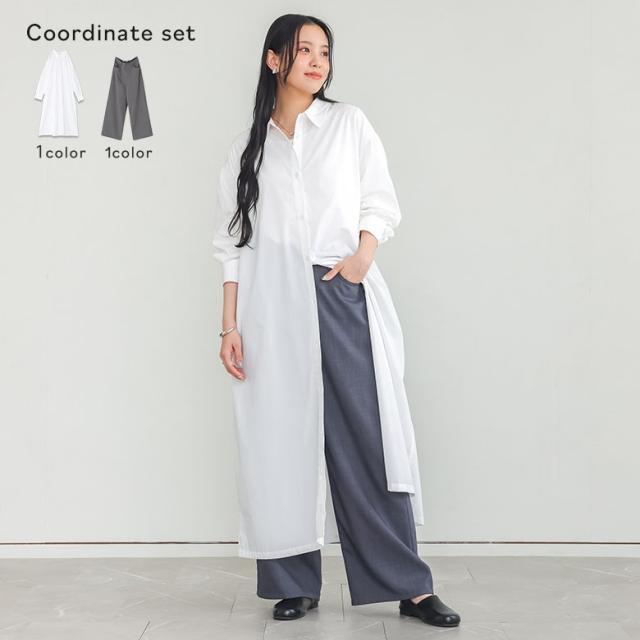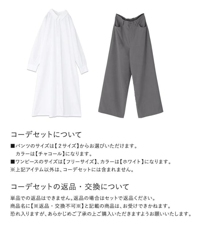 『袖ギャザーシャツワンピース×接触冷感カラーワイドパンツコーデ2点SET』【メール便不可】【30】[2点コーデセット 2026 レディース シャツワンピース ワンピース 長袖 ワイドパンツ スラックス カラーパンツ]