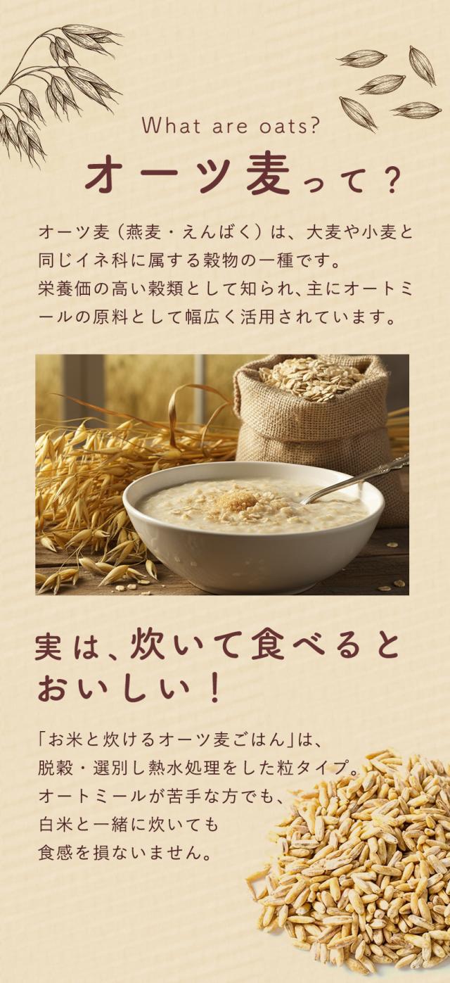 食物繊維、鉄分、たんぱく質が豊富、さらにβ-グルカンが含まれるバランス食のオーツ麦。ごはんと一緒に炊けて、おいしくお召し上がりいただける「お米と炊けるオーツ麦ごはん」。