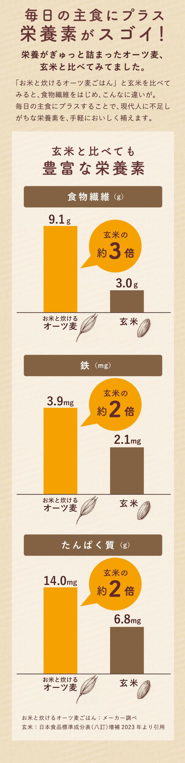 食物繊維、鉄分、たんぱく質が豊富、さらにβ-グルカンが含まれるバランス食のオーツ麦。ごはんと一緒に炊けて、おいしくお召し上がりいただける「お米と炊けるオーツ麦ごはん」。 毎日の主食にプラスするだけでバランスの摂れた栄養食に。玄米と比較しても、食物繊維は約3倍、鉄は約2倍、たんぱく質が約2倍!(メーカー調べ、玄米は日本食品標準成分表(八訂)増補2023年より引用) オーツ麦(燕麦・えんばく)は、大麦や小麦と同じイネ科に属する穀物の一種です。栄養価の高い穀類として知られ、主にオートミールの原料として幅広く活用されます。「お米と炊けるオーツ麦ごはん」は、脱穀・選別し熱水処理をした粒タイプ。オートミールが苦手な方でも、白米と一緒に炊いても食感を損なわずおいしくいただけます。 「お米と炊けるオーツ麦ごはん」には100gあたり4.3gのβ-グルカンが含まれています(メーカー調べ)。β-グルカンは水溶性食物繊維の一種で意識して摂取したい栄養素です。健康的な食生活を意識する方におすすめです。