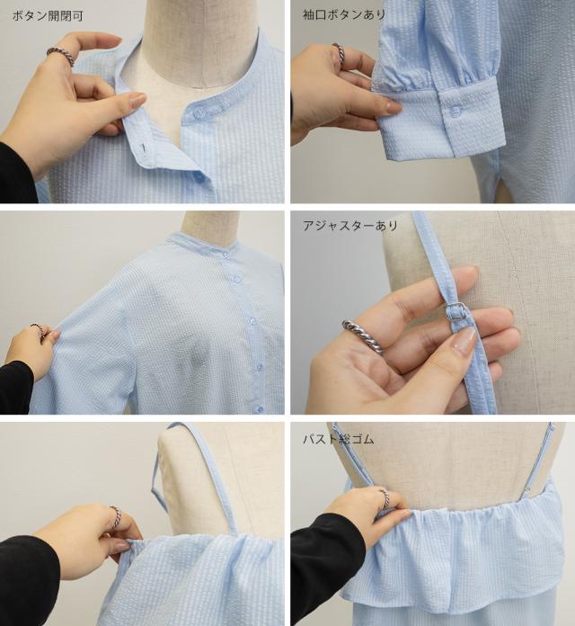 | 3Lサイズを着用しました。ブラウス・ビスチェともにちょうどいいサイズ感で、腕まわりや身頃にも窮屈感はありませんでした◎ 春夏にピッタリな、さらっとした軽い生地感です!セットで着るとメリハリのあるレイヤードスタイルが完成して、一気におしゃれ感がアップしビスチェがふんわりお腹周りもカバーしてくれて、すっきり着やます♪せして見えます!ブラウス単体でも使えるので、着回し力も抜群です。 |