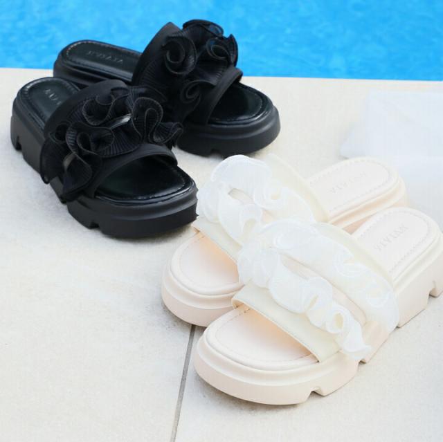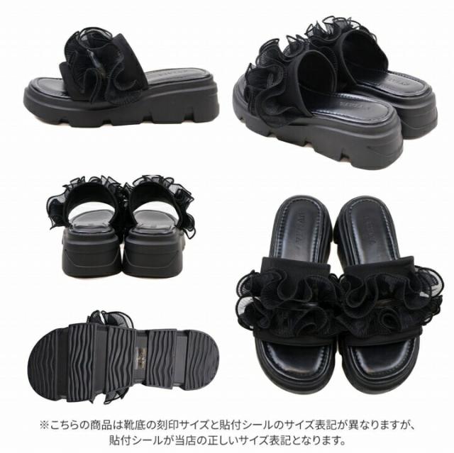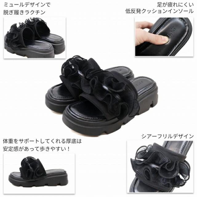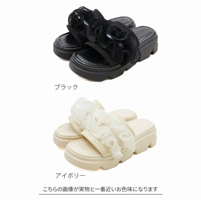 Vivian フリル 厚底 サンダル レディース ミュール つっかけ ブラック 黒 アイボリー 白 旅行 テーマパーク 遊園地 ライブ レジャー 痛くない 歩きやすい 疲れない キレイめ 22.5cm 23cm 23.5cm 24cm 24.5cm 25cm S M L LL 大きいサイズ 小さいサイズ 春 夏 通勤 オフィス 10代 20代 30代 40代 50代 60代 Minkyme Minky me